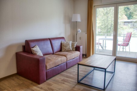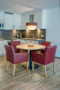 Unsere Ferienwohnung verfügt über 1 Schlafzimmer, ein Bad mit Dusche und Whirlwanne, einen Wohn/Essbereich mit voll ausgestatteter Markenküche und Schlafcouch sowie einen großen Balkon. Sie bietet Platz für bis zu 4 Personen.